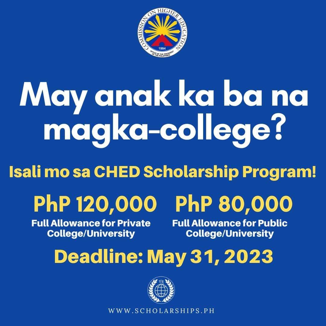 Here are the details for CHED Scholarship 2023:https://governmentph.com/ched-merit/